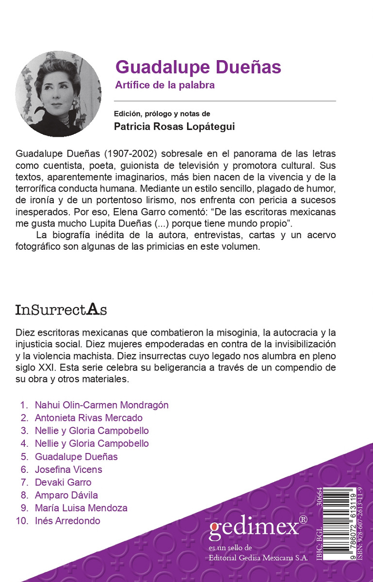 Guadalupe Dueñas (1907-2002), sobresale en el panorama de las letras como cuentista, poeta, guionista de televisión y promotora cultural. Sdus textos, aparentemente imaginarios, más bien nacen de la vivencia y de la terrorífica conducta humana. Mediante un estilo sencillo, plagado de humor, de ironía y de un portentoso lirismo, nos enfrenta con pericia a sucesos inesperados. Por eso, Elena Garro comentó: "de las escritoras mexicanas me gusta mucho Lupita Dueñas (...) porque tiene mundo propio". La biografía inédita de la autora, entrevistas, cartas y un acervo fotográfico son algunas de lasprimicias en este volumen.