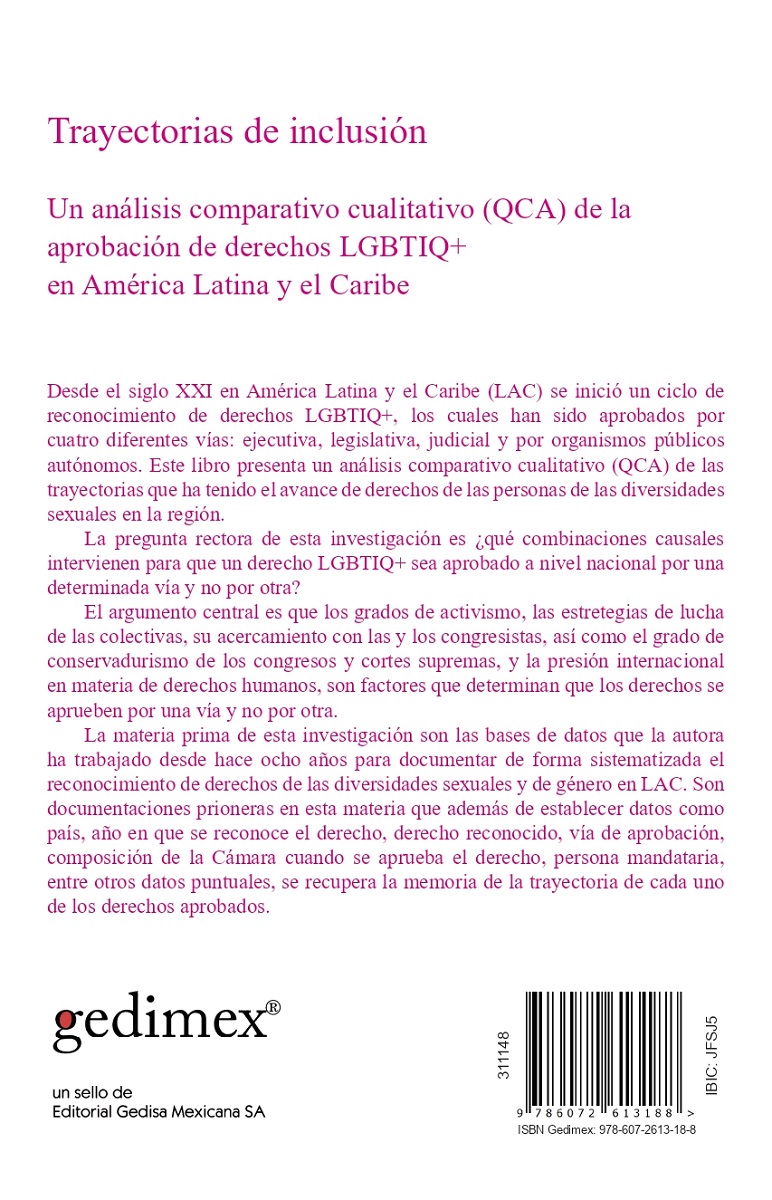 Desde el siglo XXI en América Latina y el Caribe (LAC) se inició un ciclo de reconocimiento de derechos LGBTIQ+, los cuales han sido aprobados por cuatro diferentes vías: ejecutiva, legislativa, judicial y por organismos públicos autónomos. Este libro presenta un análisis comparativo cualitativo (QCA) de las trayectorias que ha tenido el avance de derechos de las personas de las diversidades sexuales y de género en la región. La pregunta rectora de esta investigación es: ¿qué combinaciones causales intervienen para que un derecho LGBTIQ+ sea aprobado, a nivel nacional, por una determinada vía y no por otra? El argumento central es que los grados de activismo, las estrategias de lucha de las colectivas, su acercamiento con las y los congresistas, así como el grado de conservadurismo de los congresos y cortes supremas, y la presión internacional en materia de derechos humanos, son factores que determinan que los derechos se aprueben por una vía y no por otra. La materia prima de esta investigación son las bases de datos que la autora ha trabajado desde hace ocho años para documentar, de forma sistematizada, el reconocimiento de derechos de las diversidades sexuales y de género en LAC. Son documentaciones pioneras en esta materia que, además de establecer datos como país, año en que se reconoce el derecho, derecho reconocido, vía de aprobación, composición de la Cámara cuando se aprueba el derecho y persona mandataria, entre otros datos puntuales, recuperan la memoria de la trayectoria de cada uno de los derechos aprobados.