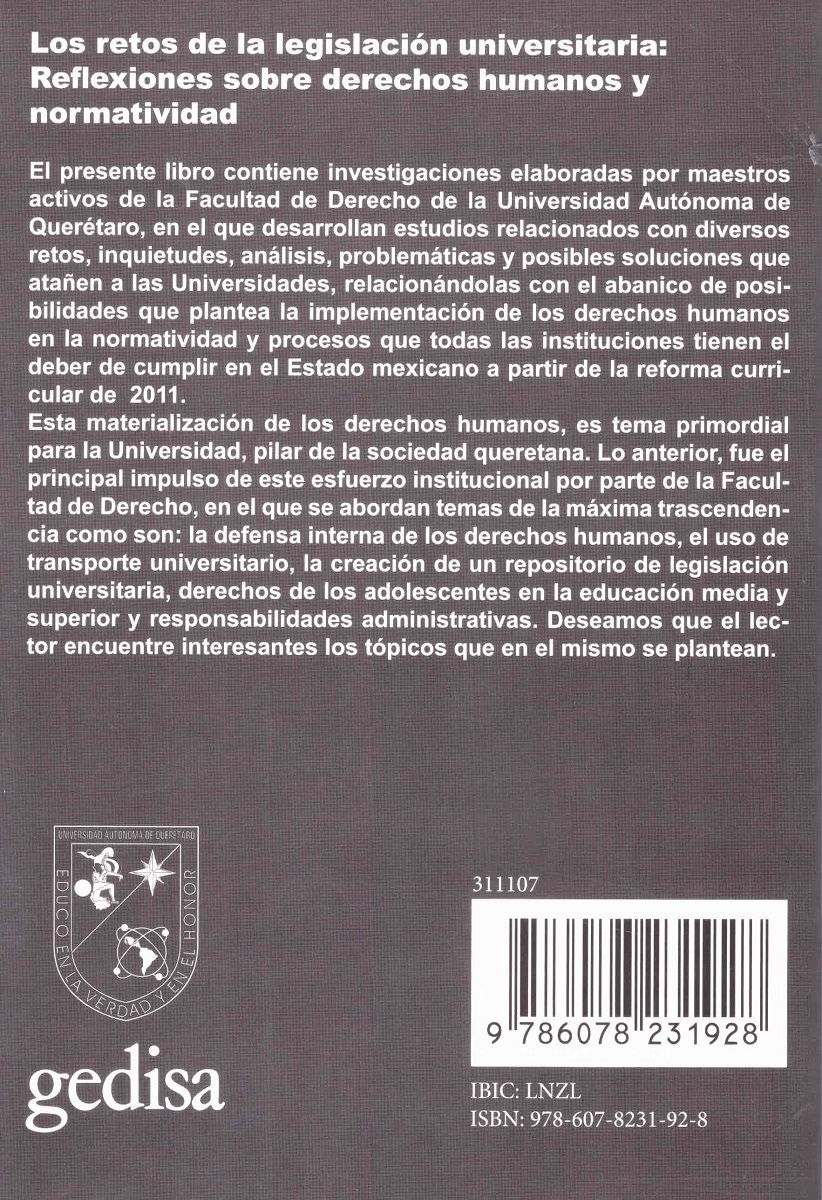 El presente libro contiene investigaciones elaboradas por maestros activos de la Facultad de Derecho de la Universidad Autónoma de Querétaro, en el que desarrollan estudios relacionados con diversos retos, inquietudes, análisis, problemáticas y posibles soluciones que atañen a las Universidades, relacionándolas con el abanico de posibilidades que plantea la implementación de los derechos humanos en la normatividad y procesos que todas las instituciones tienen el deber de cumplir en el Estado mexicano a partir de la reforma curricular de 2011. Esta materialización de los derechos humanos, es tema primordial para la Universidad, pilar de la sociedad queretana. Lo anterior, fue el principal impulso de este esfuerzo institucional por parte de la Facultad de Derecho, en el que se abordan temas de la máxima trascendencia como son: la defensa interna de los derechos humanos, el uso de transporte universitario, la creación de un repositorio de legislación universitaria, derechos de los adolescentes en la educación media y superior y responsabilidades administrativas. Deseamos que el lector encuentre interesantes los tópicos que en el mismo se plantean.