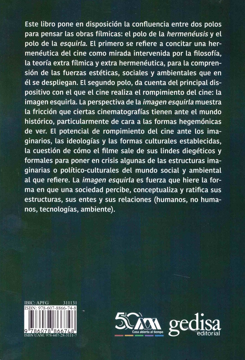 Este libro pone en disposición la confluencia entre dos polos para pensar las obras fílmicas: el polo de la hermenéusis y el polo de la esquirla. El primero se refiere a concitar una hermenéutica del cine como mirada intervenida por la filosofía, la teoría extra fílmica y extra hermenéutica, para la comprensión de las fuerzas estéticas, sociales y ambientales que en él se despliegan. El segundo polo, da cuenta del principal dispositivo con el que el cine realiza el rompimiento del cine: la imagen esquirla. La perspectiva de la imagen esquirla muestra la fricción que ciertas cinematografías tienen ante el mundo histórico, particularmente de cara a las formas hegemónicas de ver. El potencial de rompimiento del cine ante los imaginarios, las ideologías y las formas culturales establecidas, la cuestión de cómo el filme sale de sus lindes diegéticos y formales para poner en crisis algunas de las estructuras imaginarias o político-culturales del mundo social y ambiental al que refiere. La imagen esquirla es fuerza que hiere la forma en que una sociedad percibe, conceptualiza y ratifica sus estructuras, sus entes y sus relaciones (humanos, no humanos, tecnologías, ambiente)