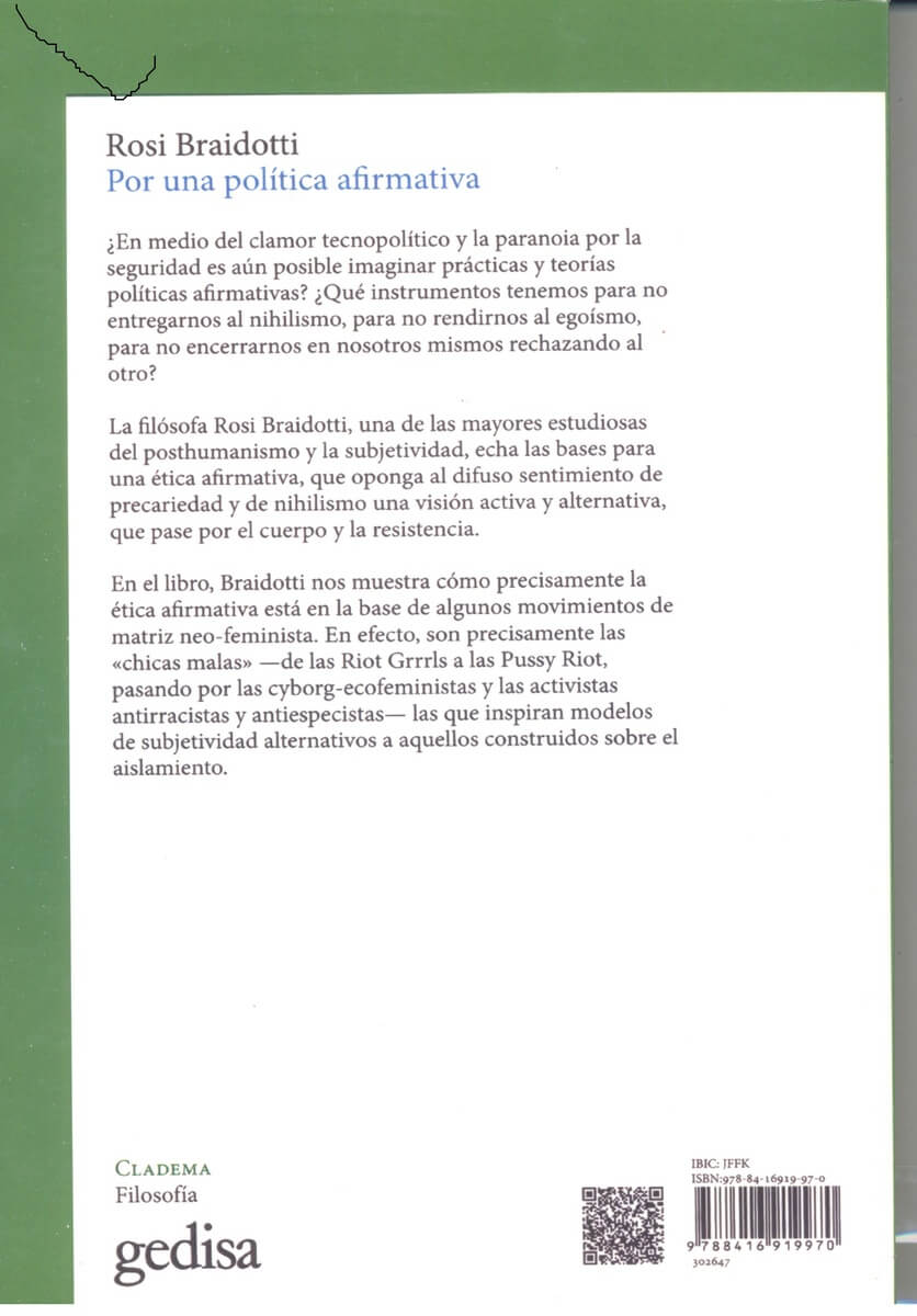 En el libro, Braidotti muestra cómo precisamente la ética afirmativa está en la base de algunos movimientos de matriz neo-feminista. En efecto, son precisamente las «chicas malas» —de las Riot Grrrls a las Pussy Riot, pasando por las cyborg-ecofeministas y las activistas antirracistas y antiespecistas— las que inspiran modelos de subjetividad alternativos a aquellos construidos sobre el aislamiento.