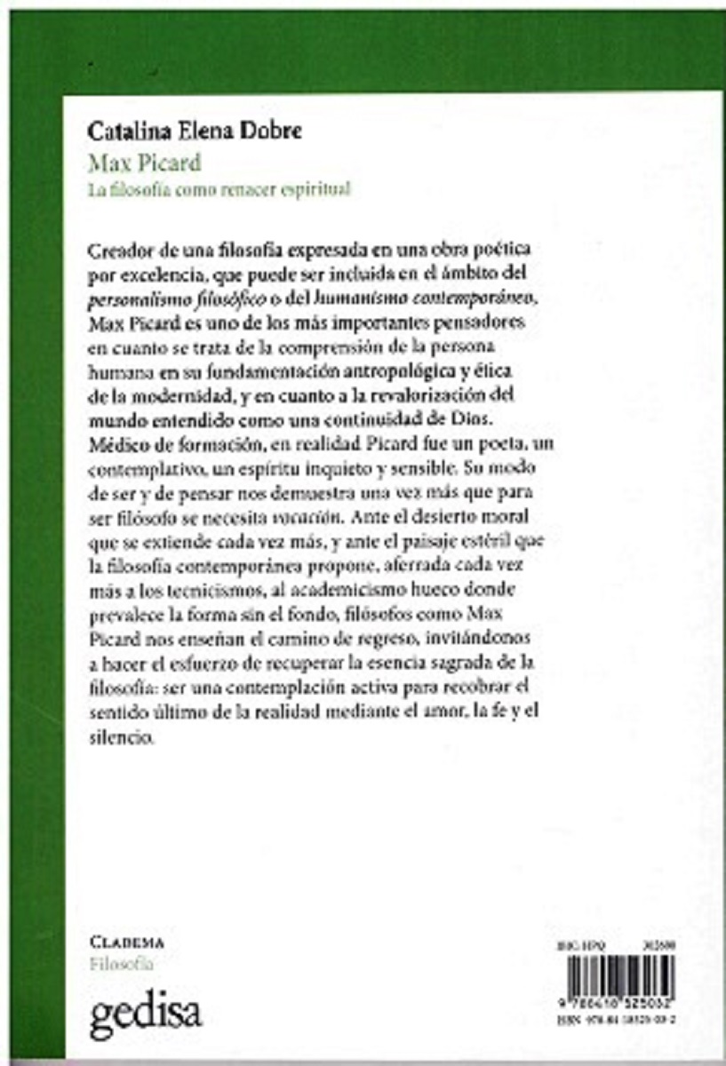 Creador de una filosofía expresada en una obra poética por excelencia, que puede ser incluida en el ámbito del personalismo filosófico o del humanismo contemporáneo, Max Picard es uno de los más importantes pensadores en cuanto se trata de la comprensión de la persona humana en su fundamentación antropológica y ética de la modernidad, y en cuanto a la revalorización del mundo entendido como una continuidad de Dios. Médico de formación, en realidad Picard fue un poeta, un contemplativo, un espíritu inquieto y sensible. Su modo de ser y de pensar nos demuestra una vez más que para ser filósofo se necesita vocación. Ante el desierto moral que se extiende cada vez más, y ante el paisaje estéril que la filosofía contemporánea propone, aferrada cada vez más a los tecnicismos, al academicismo hueco donde prevalece la forma sin el fondo, filósofos como Max Picard nos enseñan el camino de regreso, invitándonos a hacer el esfuerzo de recuperar la esencia sagrada de la filosofía: ser una contemplación activa para recobrar el sentido último de la realidad mediante el amor, la fe y el silencio.