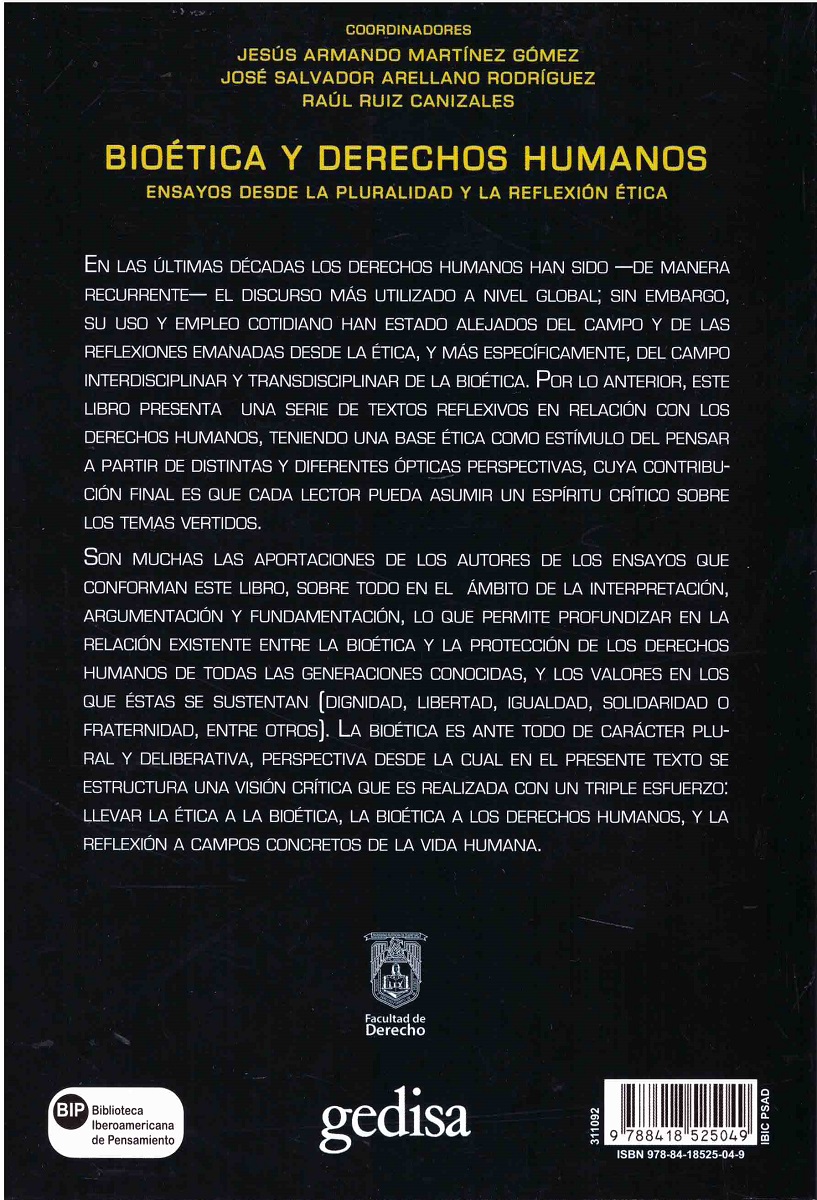 En las últimas décadas los derechos humanos han sido —de manera recurrente— el discurso más utilizado a nivel global; sin embargo, su uso y empleo cotidiano han estado alejados del campo y de las reflexiones emanadas desde la ética, y más específicamente, del campo interdisciplinar y transdisciplinar de la bioética. Por lo anterior, este libro presenta una serie de textos reflexivos en relación con los derechos humanos, teniendo una base ética como estímulo del pensar a partir de distintas y diferentes ópticas perspectivas, cuya contribución final es que cada lector pueda asumir un espíritu crítico sobre los temas vertidos. Son muchas las aportaciones de los autores de los ensayos que conforman este libro, sobre todo en el ámbito de la interpretación, argumentación y fundamentación, lo que permite profundizar en la relación existente entre la bioética y la protección de los derechos humanos de todas las generaciones conocidas, y los valores en los que éstas se sustentan (dignidad, libertad, igualdad, solidaridad o fraternidad, entre otros). La bioética es ante todo de carácter plural y deliberativo, perspectiva desde la cual en el presente texto se estructura una visión crítica que es realizada con un triple esfuerzo: llevar la ética a la bioética, la bioética a los derechos humanos, y la reflexión a campos concretos de la vida humana