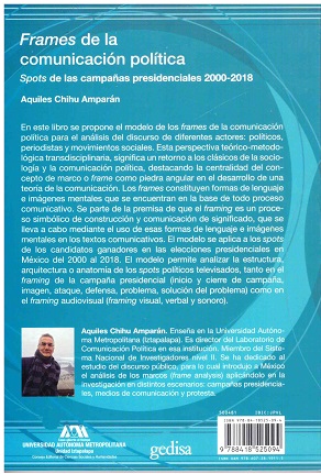 En este libro se propone el modelo de los frames de la comunicación política para el análisis del discurso de diferentes actores; políticos, periodistas y movimientos sociales. Esta perspectiva teórico-metodológica transdisciplinaria, significa un retorno a los clásicos de la sociología y la comunicación política, destacando la centralidad del concepto de marco o frame como piedra angular en el desarrollo de una teoría de la comunicación. Los frames constituyen formas de lenguaje e imágenes mentales que se encuentran en la base de todo proceso comunicativo. Se parte de la premisa de que el framing es un proceso simbólico de construcción y comunicación de significado, que se lleva a cabo mediante el uso de esas formas del lenguaje e imágenes mentales en los textos comunicativos. El modelo se aplica a los spots de los candidatos ganadores en las elecciones presidenciales en México del 2000 al 2018. El modelo permite analizar la estructura, arquitectura o anatomía de los spots políticos televisados, tanto en el framing de la campaña presidencial (inicio y cierre de campaña, imagen, ataque, defensa, problema, solución del problema) como en el framing audiovisual (framing visual, verbal y sonoro).