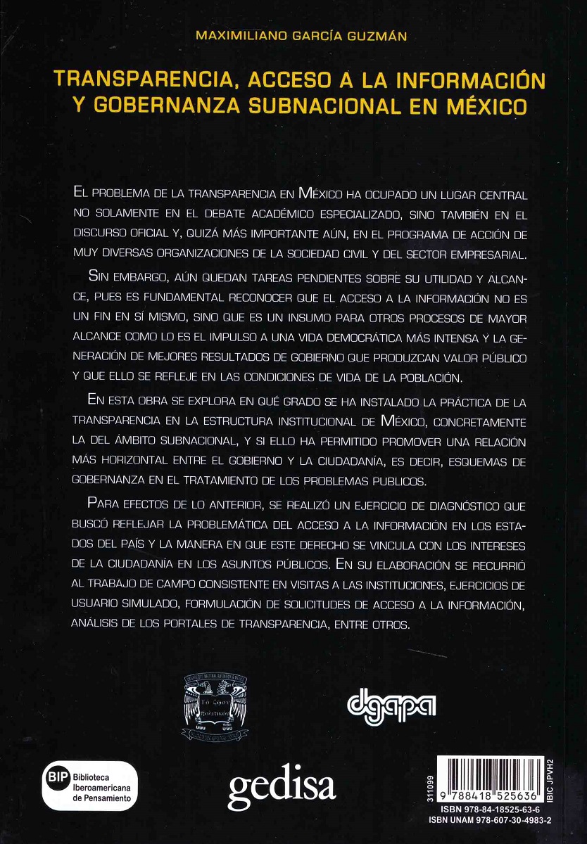 El problema de la transparencia en México ha ocupado un lugar central no solamente en el debate académico especializado, sino también en el discurso oficial y, quizá más importante aún, en el programa de acción de muy diversas organizaciones de la sociedad civil y del sector empresarial. Sin embargo, aún quedan tareas pendientes sobre su utilidad y alcance, pues es fundamental reconocer que el acceso a la información no es un fin en sí mismo, sino que es un insumo para otros procesos de mayor alcance como lo es el impulso a una vida democrática más intensa y la generación de mejores resultados de gobierno que produzcan valor público y que ello se refleje en las condiciones de vida de la población. En esta obra se explora en qué grado se ha instalado la práctica de la transparencia en la estructura institucional de México, concretamente la del ámbito subnacional, y si ello ha permitido promover una relación más horizontal entre el gobierno y la ciudadanía, es decir, esquemas de gobernanza en el tratamiento de los problemas públicos. Para efectos de lo anterior, se realizó un ejercicio de diagnóstico que buscó reflejar la problemática del acceso a la información en los estados del país y la manera en que este derecho se vincula con los intereses de la ciudadanía en los asuntos públicos. En su elaboración se recurrió al trabajo de campo consistente en visitas a las instituciones, ejercicios de usuario simulado, formulación de solicitudes de acceso a la información, análisis de los portales de transparencia, entre otros.