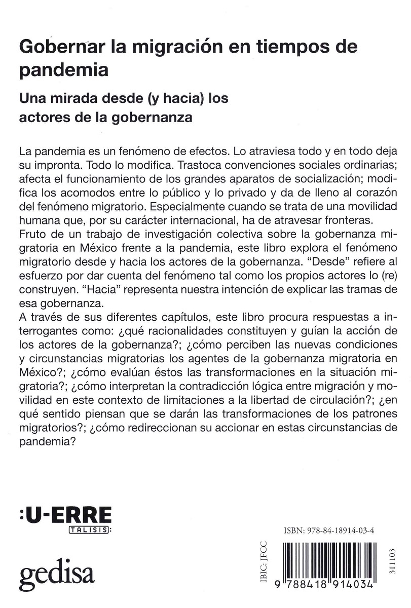 La pandemia es un fenómeno de efectos. Lo atraviesa todo y en todo deja su impronta. Todo lo modifica. Trastoca convenciones sociales ordinarias; afecta el funcionamiento de los grandes aparatos de socialización; modifica los acomodos entre lo público y lo privado y da de lleno al corazón del fenómeno migratorio. Especialmente cuando se trata de una movilidad humana que, por su carácter internacional, ha de atravesar fronteras.Fruto de un trabajo de investigación colectiva sobre la gobernanza migratoria en México frente a la pandemia, este libro explora el fenómeno migratorio desde y hacia los actores de la gobernanza. “Desde” refiere al esfuerzo por dar cuenta del fenómeno tal como los propios actores lo (re) construyen. “Hacia” representa nuestra intención de explicar las tramas de esa gobernanza. A través de sus diferentes capítulos, este libro procura respuestas a interrogantes como: ¿qué racionalidades constituyen y guían la acción de los actores de la gobernanza?; ¿cómo perciben las nuevas condiciones y circunstancias migratorias los agentes de la gobernanza migratoria en México?; ¿cómo evalúan éstos las transformaciones en la situación migratoria?; ¿cómo interpretar la contradicción lógica entre migración y movilidad en este contexto de limitaciones a la libertad de circulación?; ¿en qué sentido piensan que se darán las transformaciones de los patrones migratorios?; ¿cómo redireccionen su accionar en estas circunstancias de pandemia?