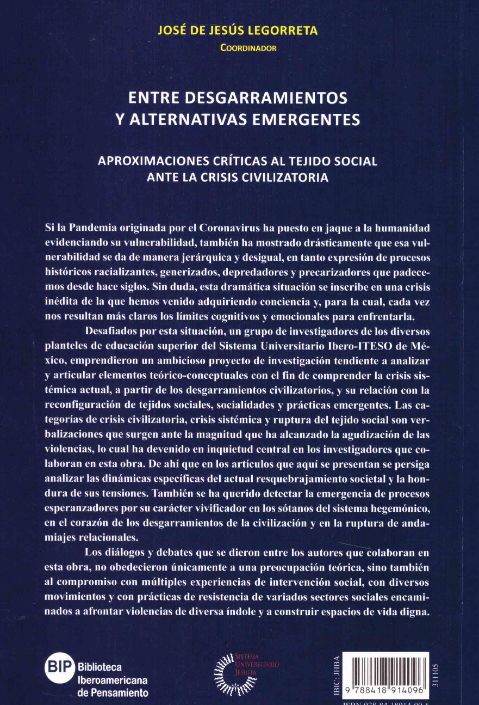 Si la Pandemia originada por el Coronavirus ha puesto en jaque a la humanidad evidenciando su vulnerabilidad, también ha mostrado drásticamente que esa vulnerabilidad se da de manera jerárquica y desigual, en tanto expresión de procesos históricos racializantes, generizados, depredadores y precarizadores que padecemos desde hace siglos. Sin duda, esta dramática situación se inscribe en una crisis inédita de la que hemos venido adquiriendo conciencia y, para la cual, cada vez nos resultan más claros los límites cognitivos y emocionales para enfrentarla. Desafiados por esta situación, un grupo de investigadores de los diversos planteles de educación superior del Sistema universitario Ibero-ITESO de México, emprendieron un ambicioso proyecto de investigación tendiente a analizar y articular elementos teórico-conceptuales con el fin de comprender la crisis sistémica actual, a partir de los desgarramientos civilizatorios, y su relación con la reconfiguración de los tejidos sociales, sociedades y prácticas emergentes. Las categorías de crisis civilizatoria, crisis sistémica y ruptura del tejido social son verbalizaciones que surgen ante la magnitud que ha alcanzado la agudización de las violencias, lo cual ha devenido en inquietud central en los investigadores que colaboran en esta obra, De ahí que en los artículos que aquí se presentan se persiga analizar las dinámicas específicas del actual resquebrajamiento social y la hondura de sus tensiones. También se ha querido detectar la emergencia de procesos esperanzadores por su carácter vivificador en los sótanos del sistema hegemónico, en el corazón de los desgarramientos de la civilización y en la ruptura de andamiajes relacionales. Los diálogos y debates que se dieron entre los autores que colaboran en esta obra, no obedecieron únicamente a una preocupación teórica, sino también al compromiso con múltiples experiencias de intervención social, con diversos movimientos y con prácticas de resistencia de variados sectores sociales encaminados a afrontar violencias de diversa índole y a construir espacios de vida digna.