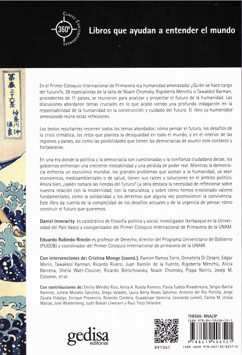 En el Primer Coloquio Internacional de Primavera «La humanidad amenazada: ¿Quién se hace cargo del futuro?», 38 especialistas de la talla de Noam Chomsky, Rigoberta Menchú o Tawakkol Karman, procedentes de 11 países, se reunieron para analizar y proyectar el futuro de la humanidad. Las discusiones abordaron temas cruciales en lo que acabó siendo una profunda indagación en la responsabilidad de la humanidad en la construcción y cuidado del futuro. El libro La humanidad amenazada reúne estas reflexiones. Los textos resultantes recorren todos los temas abordados: cómo pensar el futuro, los desafíos de la crisis climática, los retos que plantea la desigualdad en todo el mundo, y en el interior de las regiones y países, así como las posibilidades que tienen las democracias de asumir este contexto y fortalecerse. En una era donde la política y la democracia son cuestionadas y la confianza ciudadana decae, los gobiernos enfrentan una creciente inestabilidad y una pérdida de poder real. Mientras la democracia enfrenta un escrutinio mundial, los grandes problemas que azotan a la humanidad, ya sean económicos, medioambientales o de salud, tienen sus raíces y soluciones en el ámbito político Ahora bien, ¿quién tomará las riendas del futuro? La obra destaca la necesidad de reflexionar sobre nuestra relación con la modernidad, con la naturaleza, y sobre cómo hemos erosionado valores fundamentales, como la solidaridad y los derechos que alguna vez promovieron la convivencia. Este libro da cuenta de la complejidad de los desafíos actuales y de la urgencia de pensar cómoconstruir el futuro que queremos.