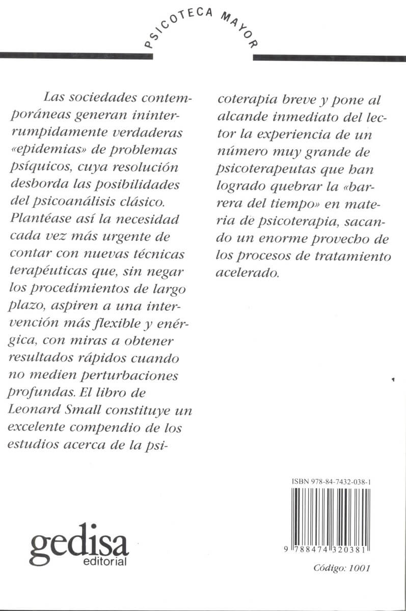 El libro de Leonard Small constituye un excelente compendio de los estudios acerca de la psicoterapia breve y pone al alcance inmediato del lector la experiencia de un número muy grande de psicoterapeutas que han logrado quebrar la "barrera del tiempo" en materia de psicoterapia, sacando un enorme provecho de los procesos de tratamiento acelerado.