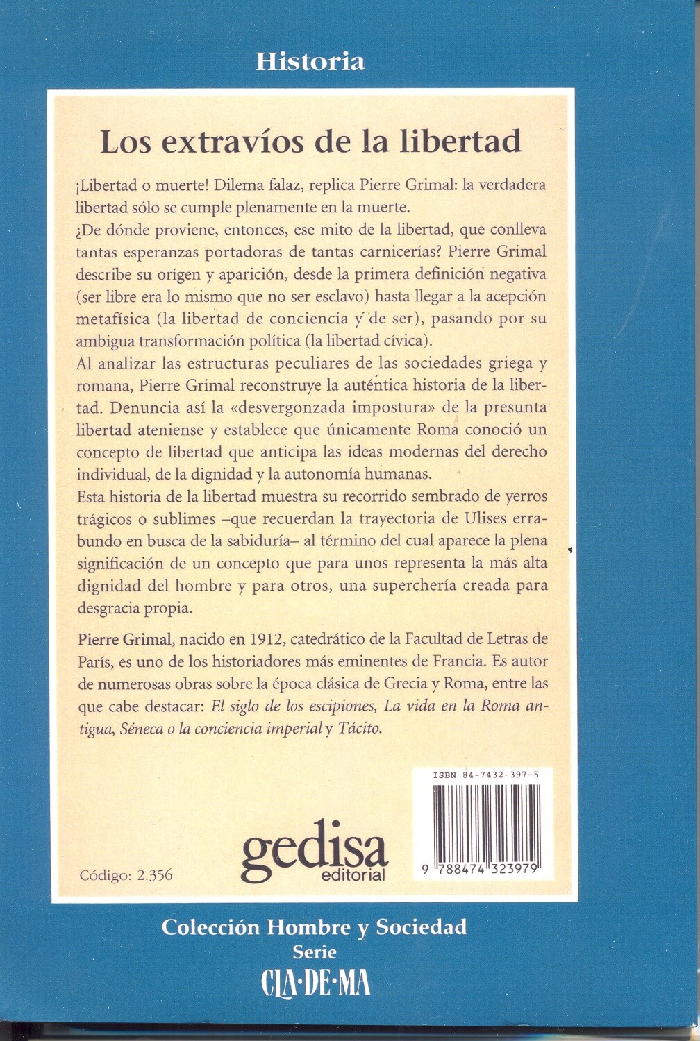 Al analizar las estructuras originales de las sociedades griega y romana, Pierre Grimal nos pone de manifiesto la auténtica historia de la libertad. Denuncia así la "desvergonzada impostura" de la presunta libertad ateniense y establece que únicamnte Roma conoció una libertad semejante a la inasible imagen que se forjan de ella los hombres.