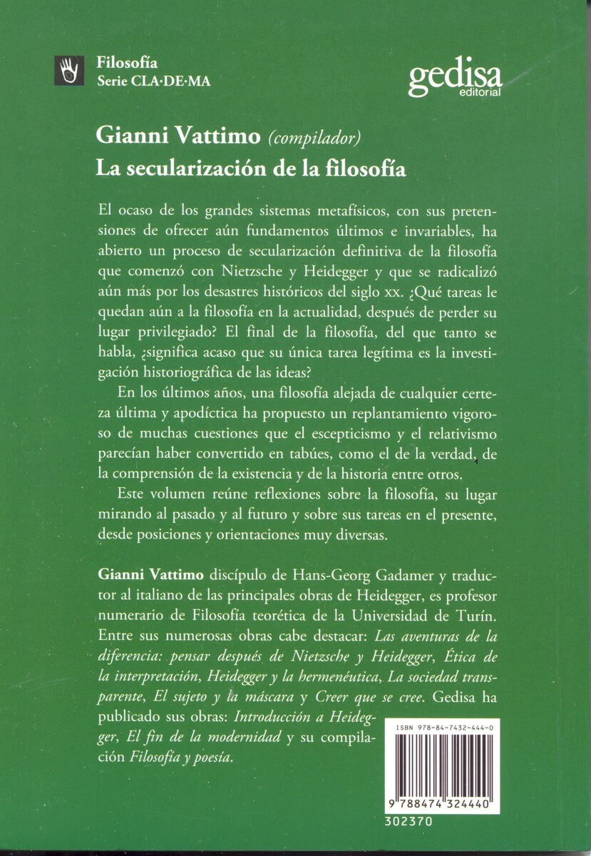 El ocaso de los grandes sistemas metafísicos, con sus pretensiones de ofrecer aún fundamentos últimos e invariables, ha abierto un proceso de secularización definitiva de la filosofía que comenzó con Nietzsche y Heidegger y que se radicalizó aún más por los desastres históricos del siglo xx.