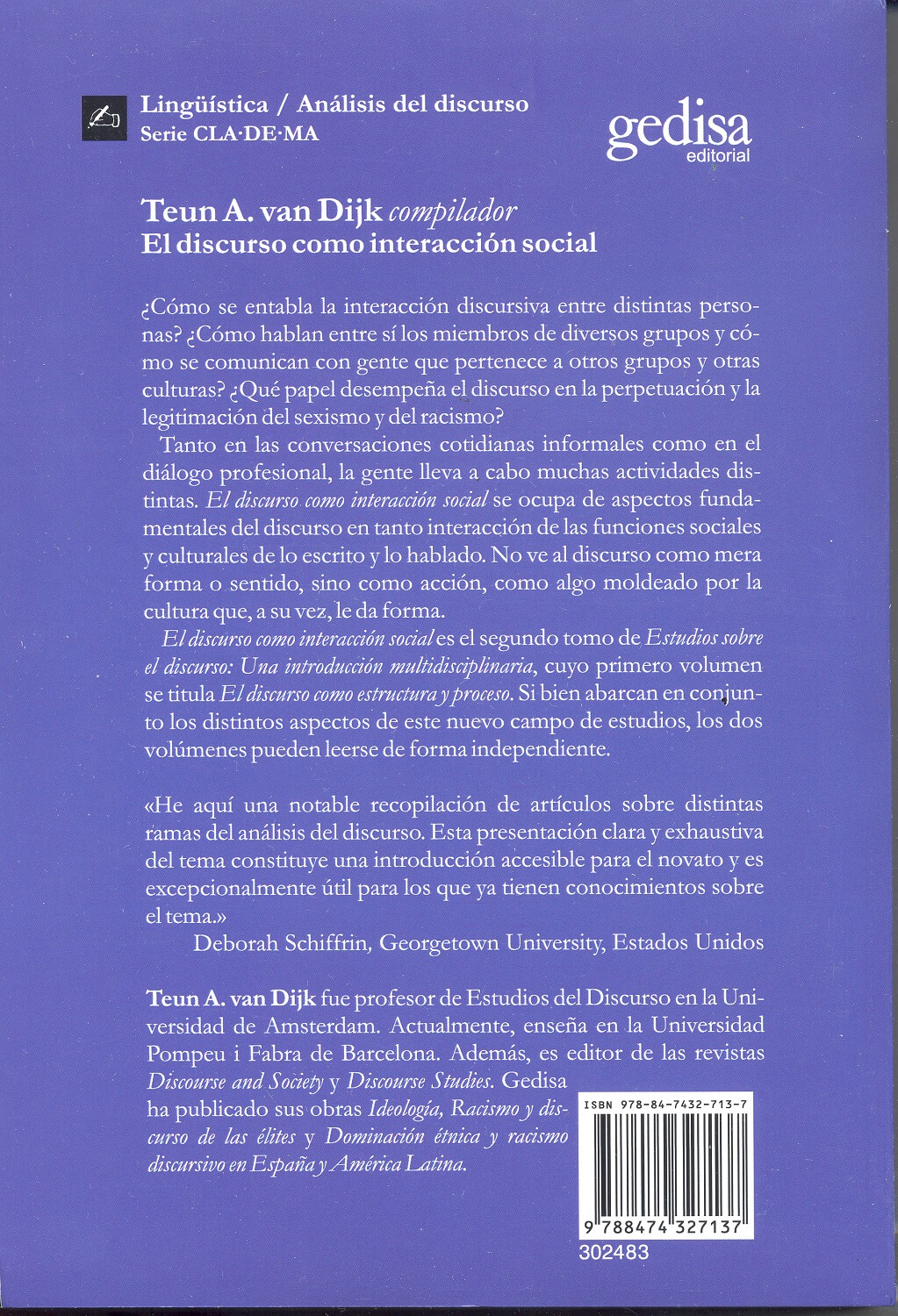 El discurso como interacción social se convertira sin duda en un texto básico para los licenciados y estudiantes avanzados de lingüística, literatura, psicología, sociología, antropología, ciencias políticas, derecho y ciencias de la comunicación.
