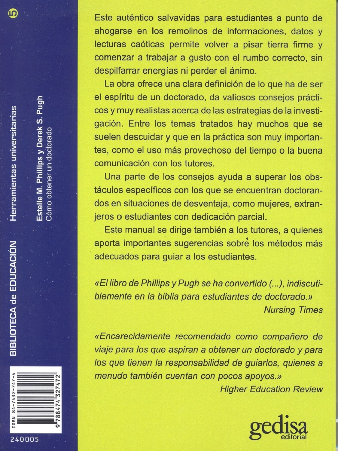 La obra ofrece una clara definición de lo que ha de ser el espíritu de un doctorado, da valiosos consejos prácticos y muy realistas acerca de las estrategias de la investigación. Entre los temas tratados hay muchos que se suelen descuidar y que en la práctica son muy importantes, como el uso más provechoso del tiempo o la buena comunicación con los tutores.