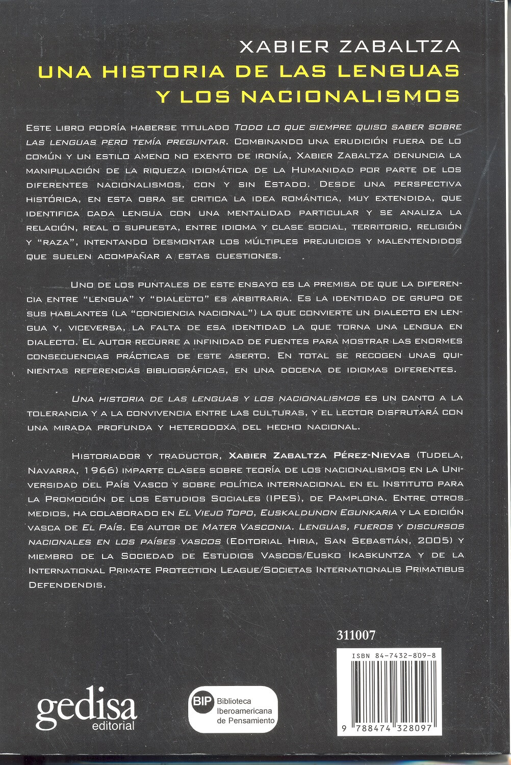 Este libro podría haberse titulado Todo lo que siempre quiso saber sobre las lenguas pero temía preguntar. Combinando una erudición fuera de lo común y un estilo ameno no exento de ironía, Xabier Zabaltza denuncia la manipulación de la riqueza idiomática de la humanidad por parte de los diferentes nacionalismos, con y sin Estado.