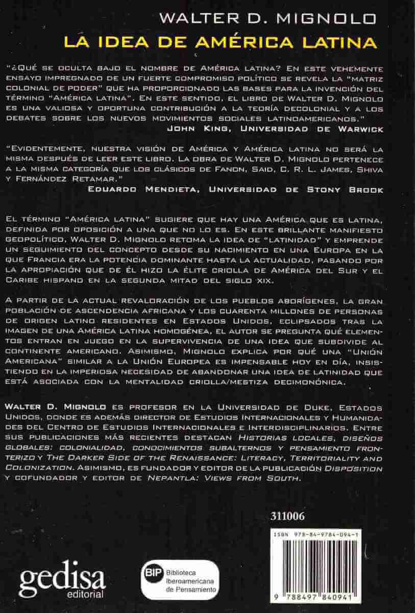 En este brillante manifiesto geopolítico, Walter Mignolo retoma la idea de "latinidad" y emprende un seguimiento del concepto desde su nacimiento en una Europa en la que Francia era la potencia dominante hasta la actualidad, pasando por la apropiación que de él hizo la élite criolla de América del Sur y el Caribe hispano en la segunda mitad del siglo XIX.