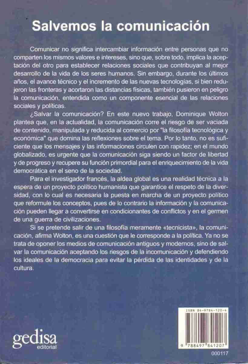 Si se pretende salir de una filosofía meramente "tecnicista" de la comunicación, afirma Wolton, esta será una cuestión que corresponderá a la política, y más precisamente, de la democracia. Oponer los medios de comunicación antiguos y modernos es una problemática del pasado que debe analizarse en conjunto.