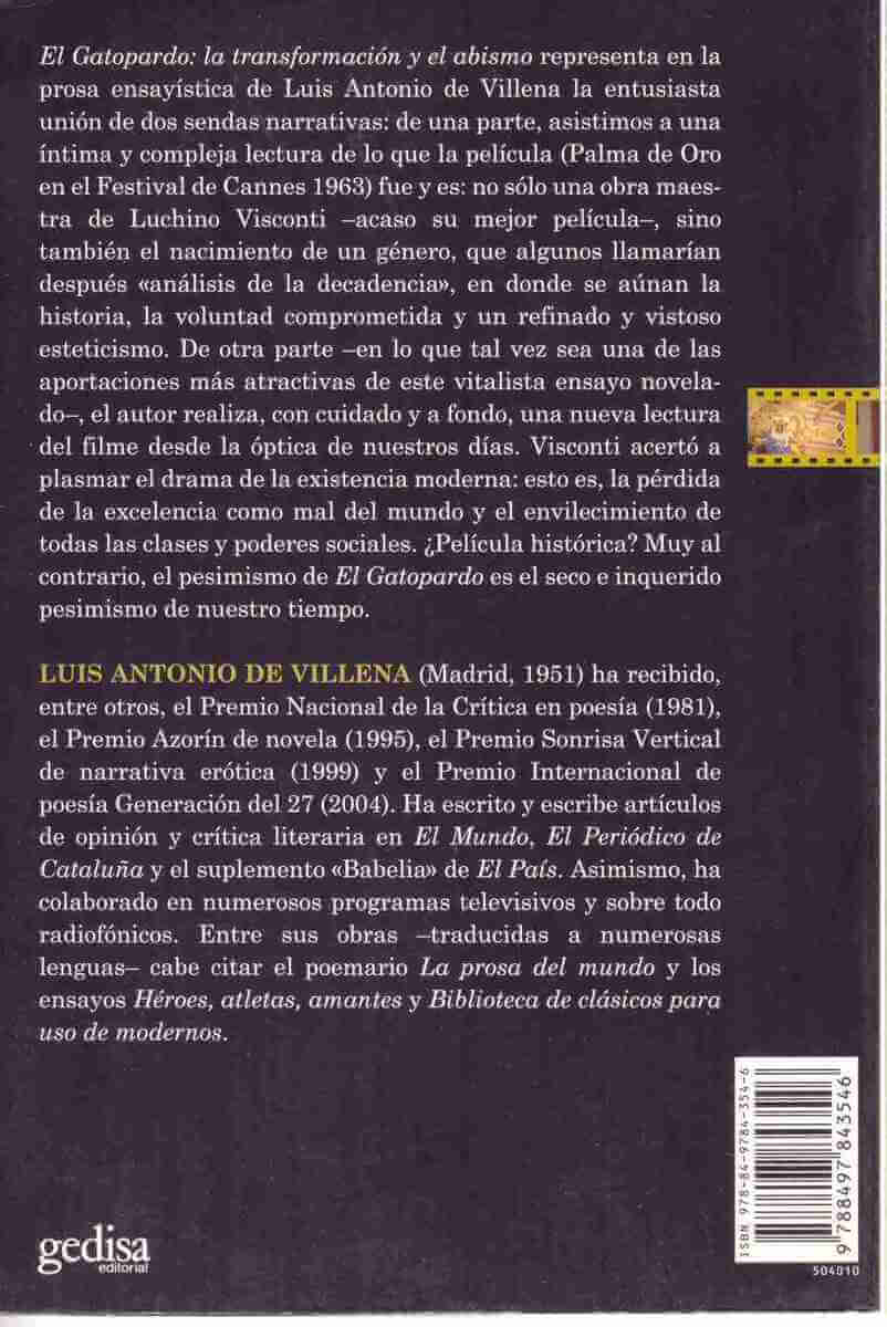 Este libro sobre El Gatopardo representa en la buena prosa ensayística del autor la unión fervorosa de dos caminos: por una parte asistimos a una íntima y compleja lectura de lo que la película (Palma de Oro en el Festival de Cannes 1963)