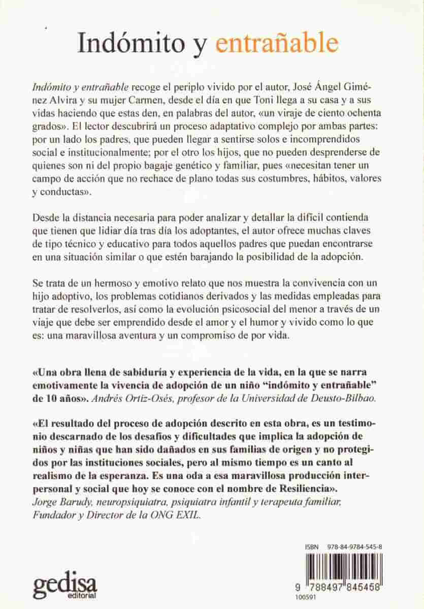 Indómito y entrañable recoge el periplo vivido por el autor, José Ángel Giménez Alvira y su mujer Carmen, desde el día en que Toni llega a su casa y a sus vidas haciendo que estas den, en palabras del autor, «un viraje de ciento ochenta grados».