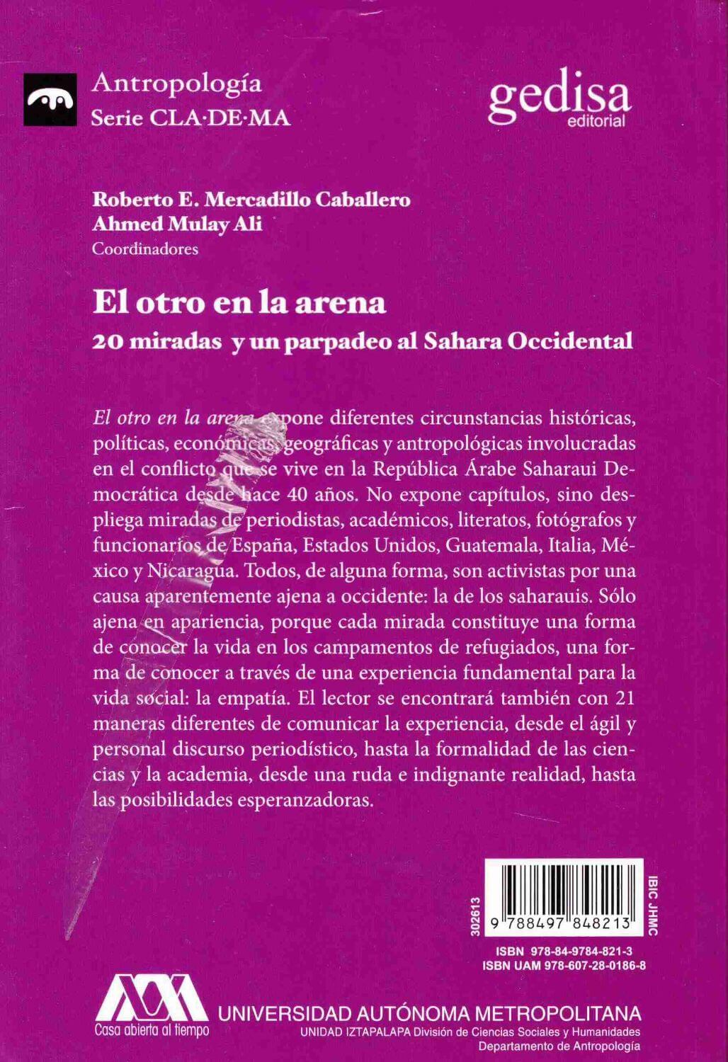 El otro en la arena expone diferentes circunstancias históricas, políticas, económicas, geográficas y antropológicas involucradas en el conflicto que se vive en la República Árabe Saharaui Democrática desde hace 40 años. No expone capítulos, sino despliega miradas de periodistas, académicos, literatos, fotógrafos y funcionarios de España, Estados Unidos, Guatemala, Italia, México, y Nicaragua.