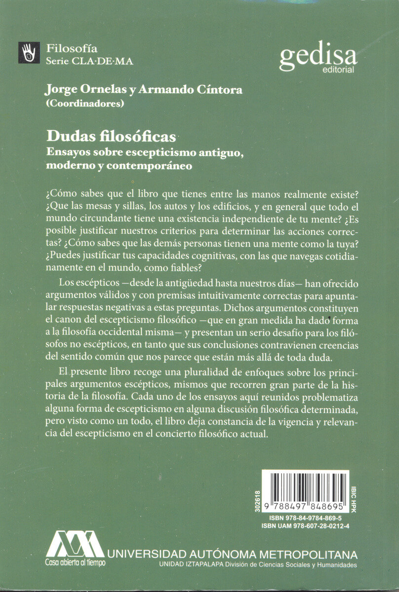 El presente libro recoge una pluralidad de enfoques sobre los principales argumentos escépticos, mismos que recorren gran parte de la historia de la filosofía. Cada uno de los ensayos aquí reunidos problematiza alguna forma de escepticismo en alguna discusión filosófica determinada, pero visto como un todo, el libro deja constancia de la vigencia y relevancia del escepticismo en el concierto filosófico actual.
