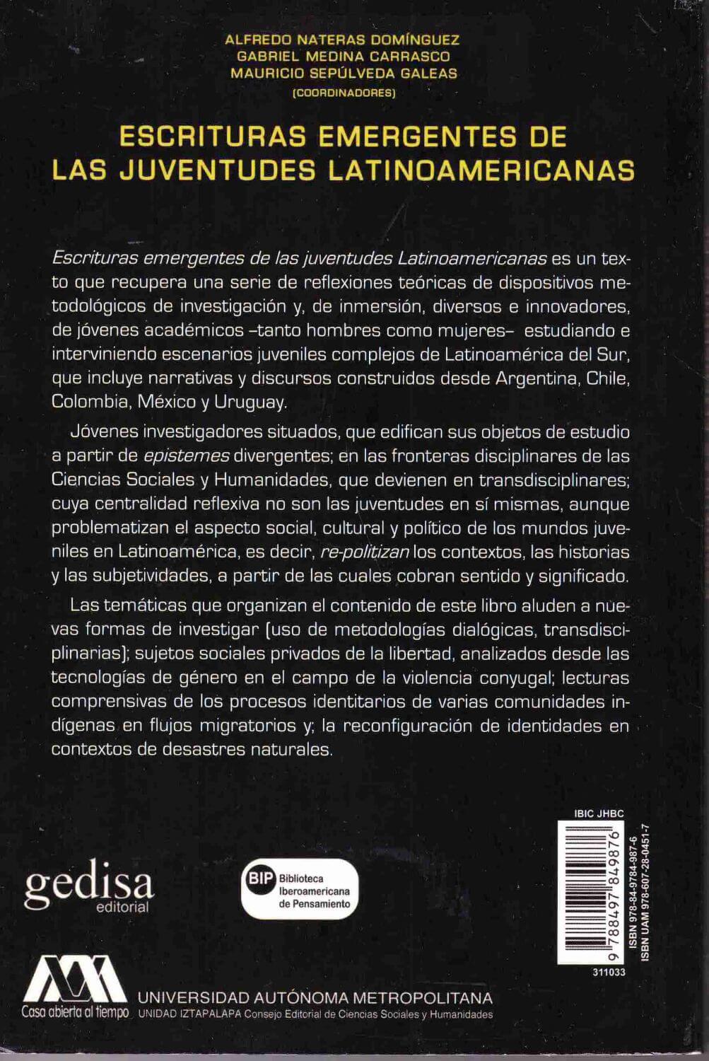 Escrituras emergentes de las juventudes Latinoamericanas es un texto que recupera una serie de reflexiones teóricas de dispositivos metodolóqicns de investigación y, de inmersión, diversos e innovadores, de jóvenes académicos -tanto hombres como mujeres- estudiando e interviniendo escenarios juveniles complejos de Latinoamérica del Sur, que incluye narrativas y discursos construidos desde Argentina, Chile, Colombia, México y Uruguay.